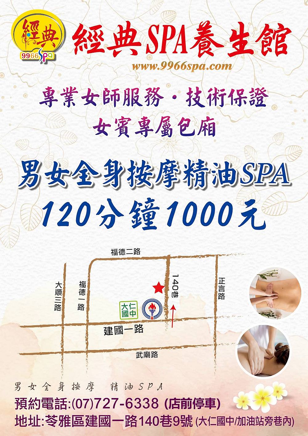 地址 : 高雄市苓雅區建國一路140巷9號(大仁國中/加油站旁巷內) 電話 : (07) 727-6338 營業時間 : 早上 9 : 00 至凌晨 1 : 00 服務項目 男女指壓推拿 腳底按摩 精油SPA 店前停車 女賓VIP包廂